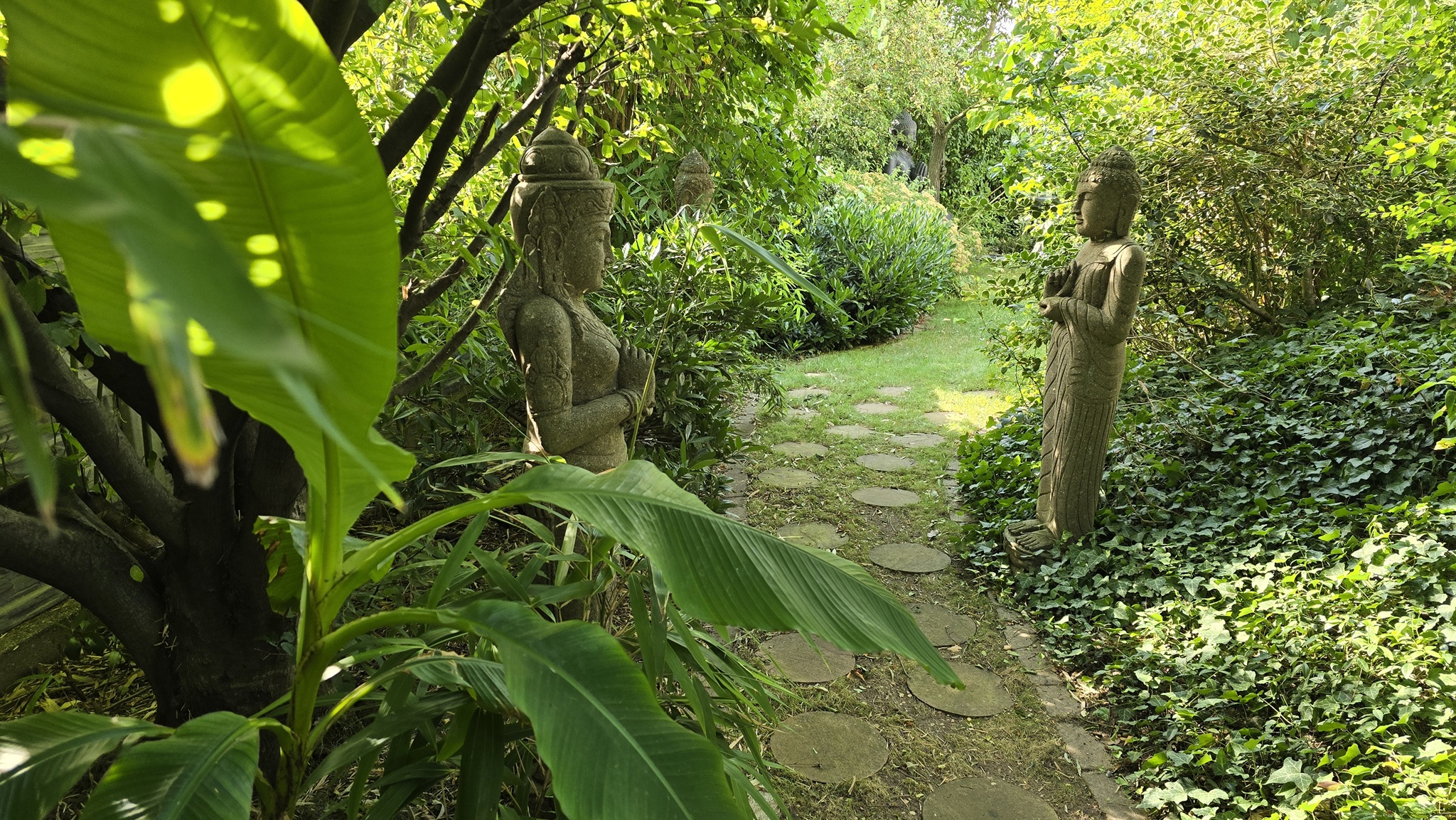 Steinbuddha und Dewi Sri im Garten Dewi Sri und Buddha aus frostfestem Basanit / Lava von Meisterhand geschlagen