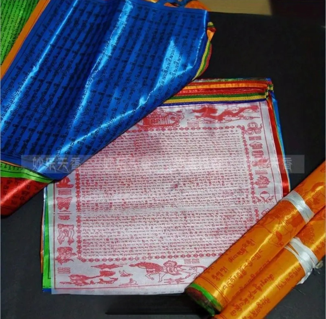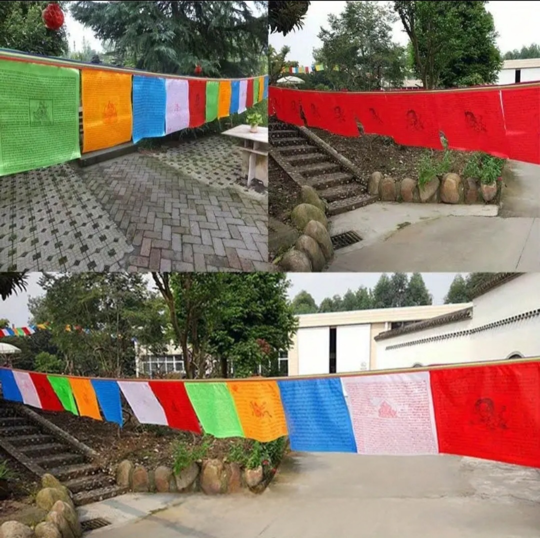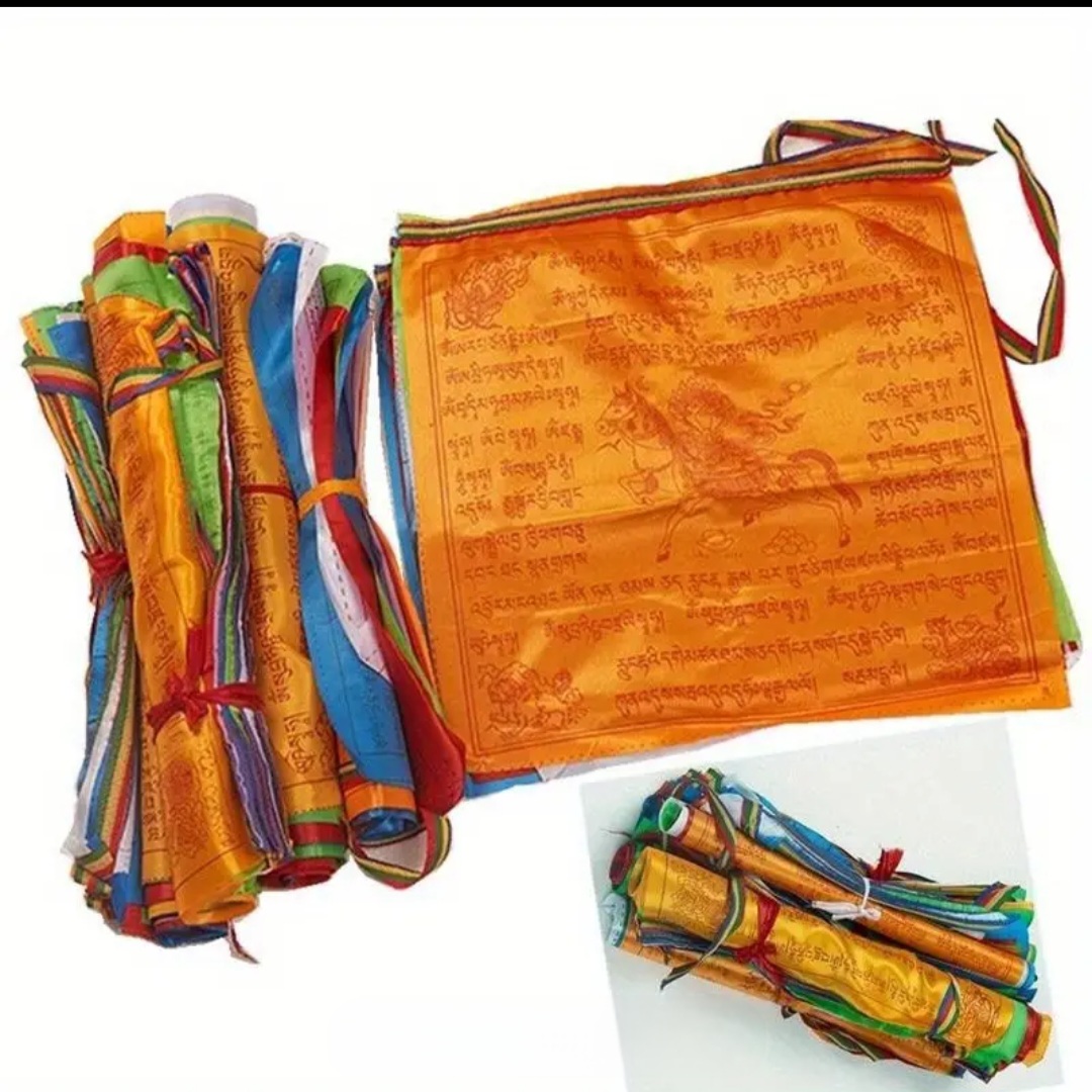 Tibetische Fahnen mit 5 m Länge, bunt mit goldenem Text, ideal für den Garten oder als Heimdekor.